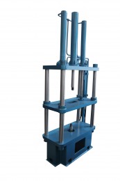 上下橫梁由立柱和螺母聯(lián)接機(jī)座組成一個(gè)剛性的機(jī)架,主液壓缸的前端用法蘭連接在上橫梁的中部,上活動(dòng)梁固定在活塞桿頂端,并連接固定上壓頭,上活動(dòng)梁依靠滑套在立柱上滑動(dòng)。模具固定在下活動(dòng)梁上,下活動(dòng)梁固定連接在頂出缸上,下活動(dòng)梁依靠兩側(cè)滑套在立柱上滑動(dòng),模套固定在模腔內(nèi),是成形制塊的主要部分。